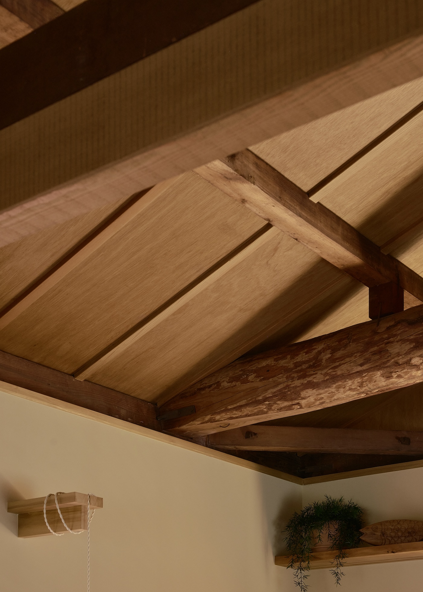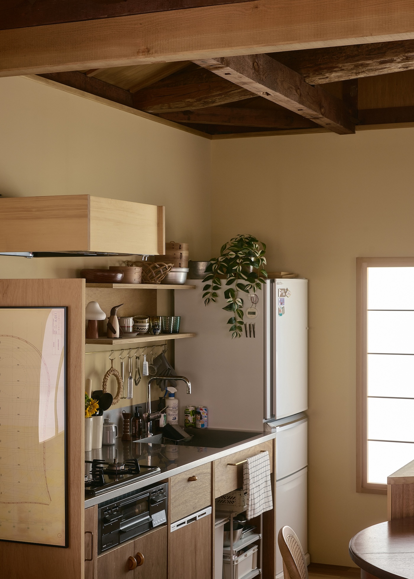 丸太の梁や傾いた躯体などの古い家が持つ揺らぎと、新たに加えた曲線や斜めの線、そして家主の持つ家具の自由な形が共鳴し合うことで、直線的で工業的な色は薄れて、全体として何か生物的な佇まいを纏っているようにも感じられる。濃く焼けた古い柱梁には50年の家の記憶が刻み込まれ、和紙を張り替えた襖や、キッチンに流用した古いタンスの取手が、新旧の境を曖昧にする。太陽光は障子やガラリ戸を通して拡散され、曲面の壁をなでて奥の空間へと抜けていく。移ろう光は、きれぎれに点在するものを抽象的に繋げ、縦と横、古さと新しさ、和風と洋風、光と影、といった二元論を崩していく。