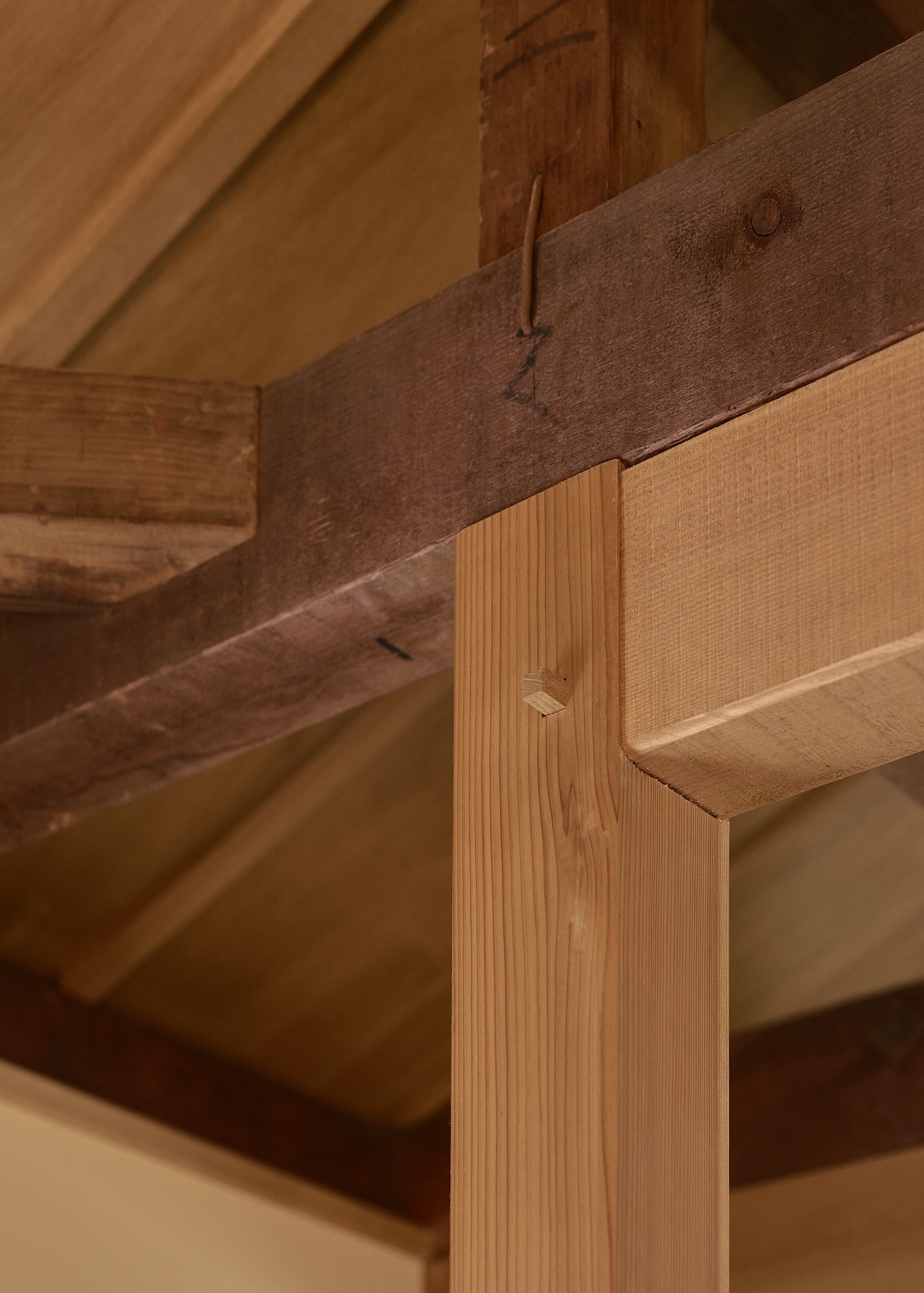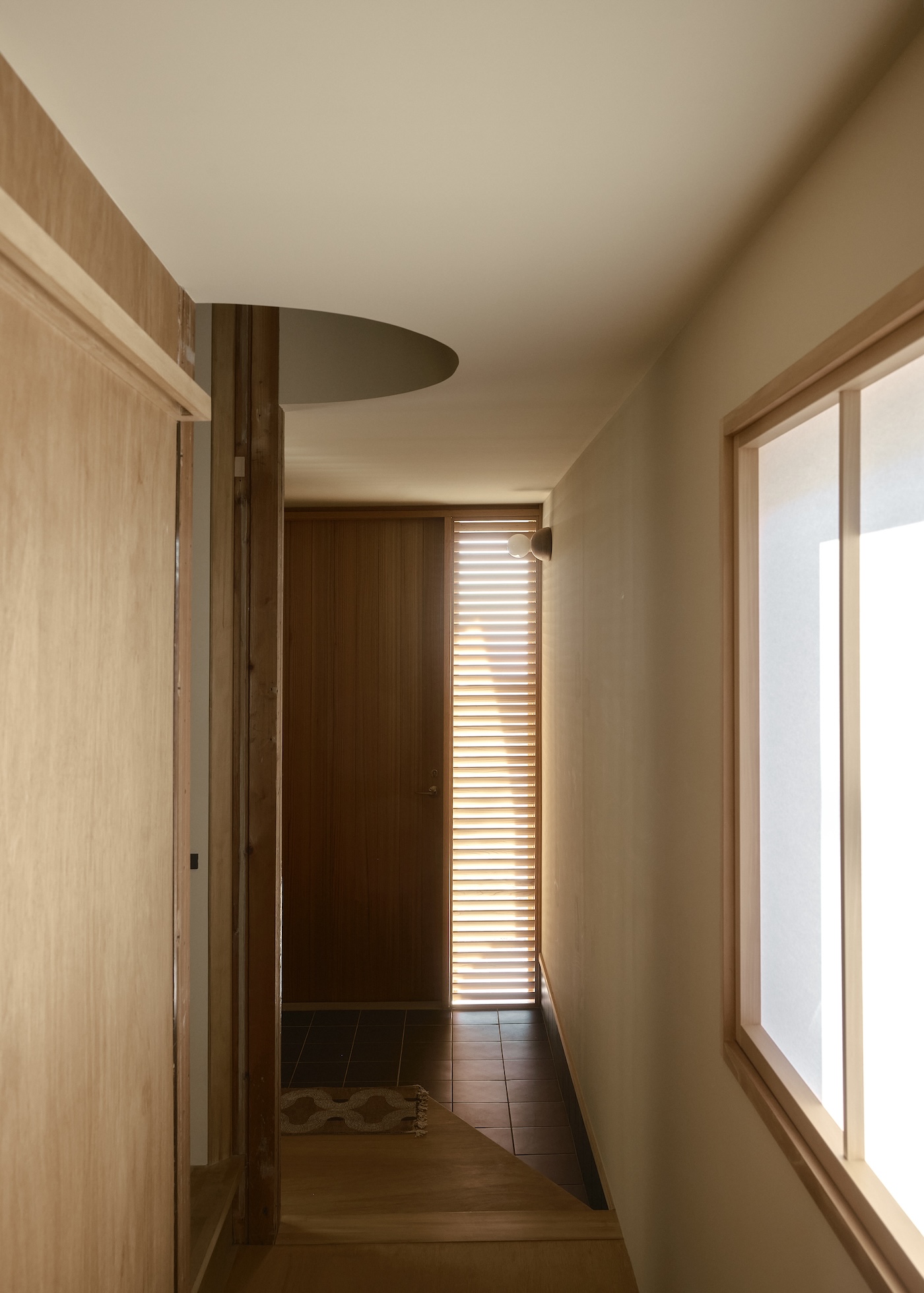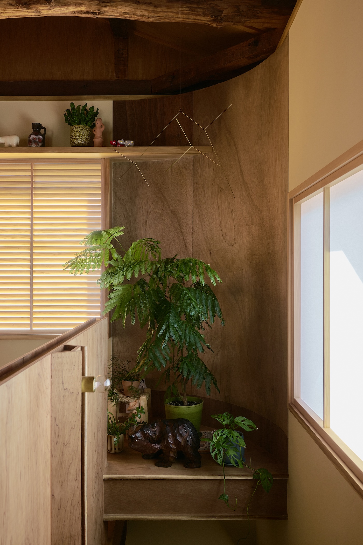 The instability of the old house such as its log beams and tilted structure, resonates with newly added curves and diagonal lines, as well as the free-form shapes of the homeowner’s furniture, softening the house’s linear, industrial feel, giving it an overall organic presence. The deeply tanned old pillars and beams hold fifty years of the house’s memory. The sliding doors with newly replaced washi paper and the handles from an old chest reused in the kitchen, blur the line between old and new. Sunlight diffuses through Shoji screens and louvers, caressing the curved walls before fading into the depths of the space. The shifting light abstractly connects the scattered elements, dissolving dualisms such as vertical and horizontal, old and new, Japanese and Western, light and shadow.
