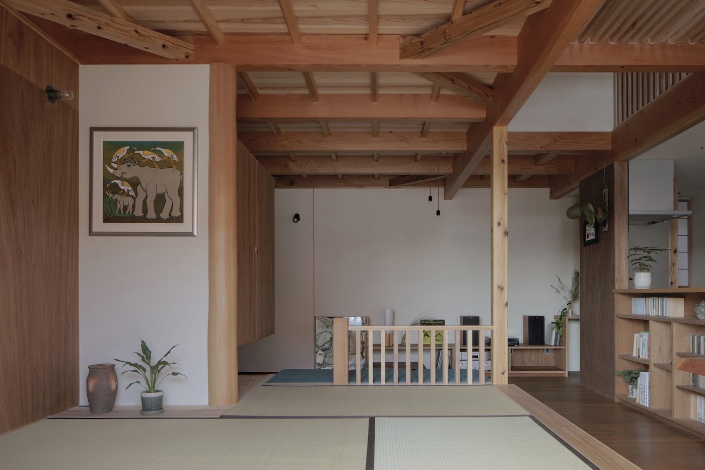 The site is a flagpole-shaped lot located amid a mixture of traditional Japanese houses and contemporary developer-built homes, a place that reflects an ongoing transition of time. With a limited budget, and in designing a house for a family of five suited to this place, the image I had in mind was that of a traditional Japanese house. Timber framing is exposed through shinkabe construction (shinkabe: a traditional Japanese method in which columns and beams are expressed on the interior), a stripped-down appearance free of excess. Spatial relationships allow inside and outside, and room and room, to remain loosely connected rather than rigidly separated. Even with a small floor area, such transparency makes the house feel open rather than confined. At a time when construction costs continue to rise, I believed that reconsidering the wisdom embedded in traditional Japanese houses was the most rational approach.