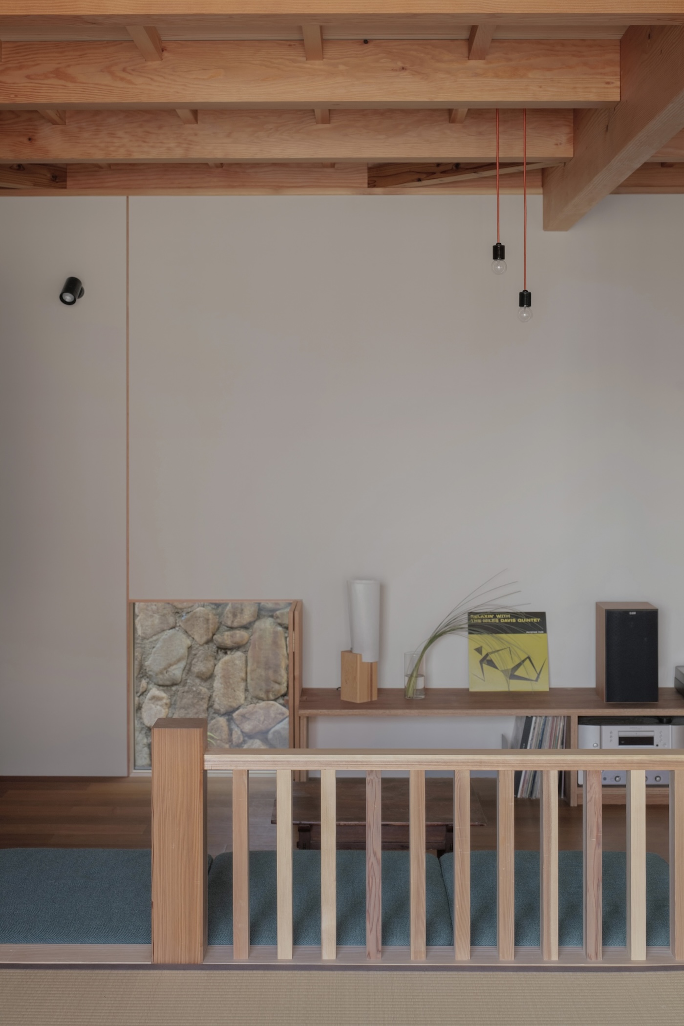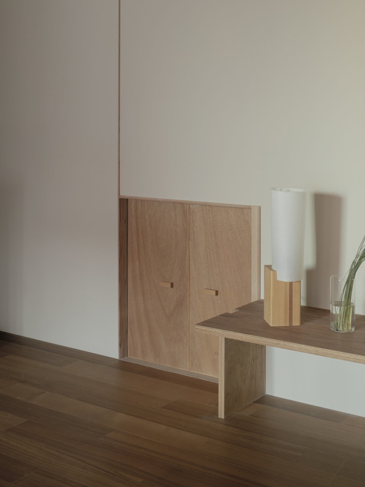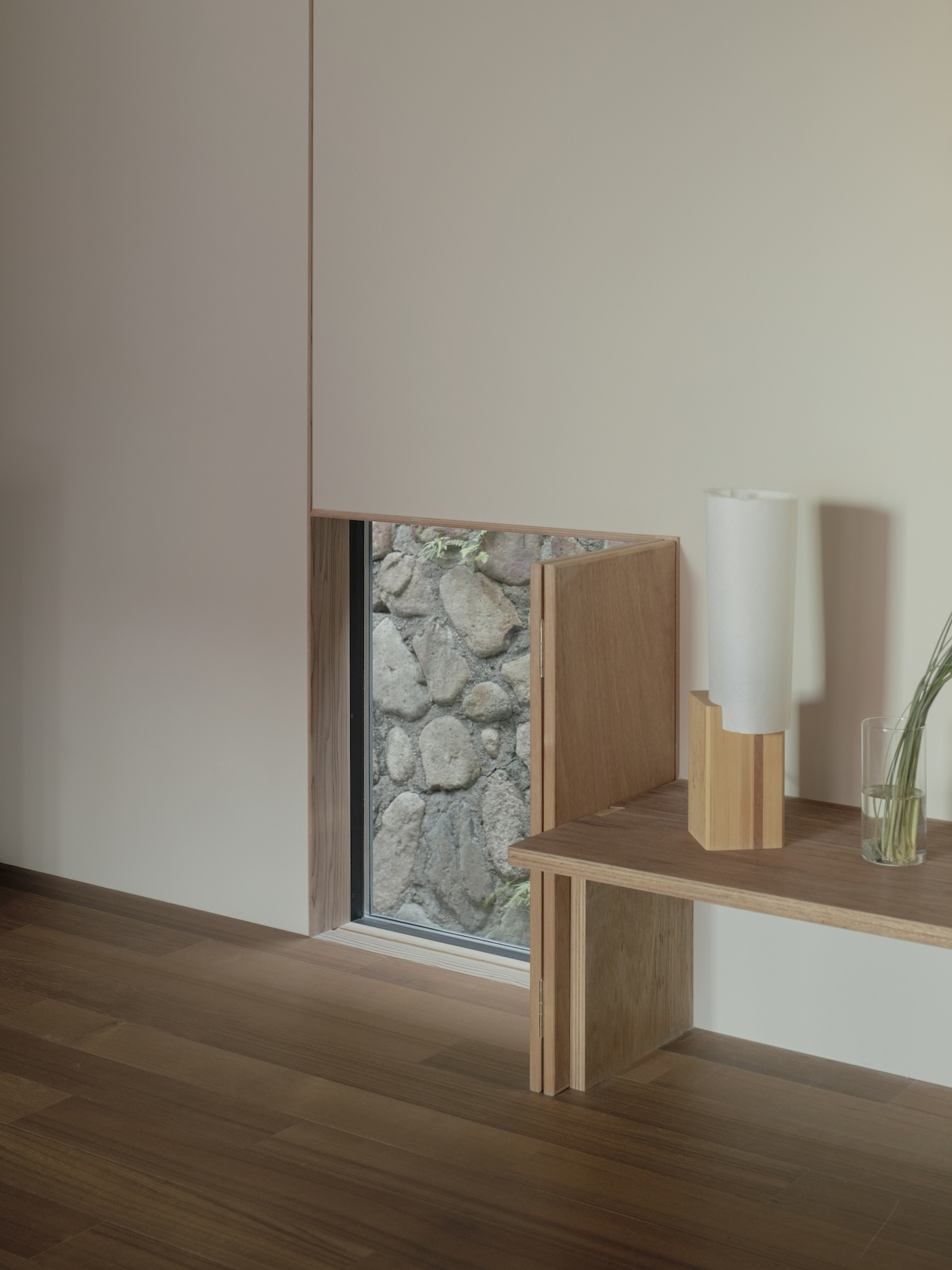 The various requirements placed on the house—such as client requests, performance, and cost—were carefully adjusted through a contemporary interpretation of the sensibilities of Japanese dwelling. In the Japanese-style room, a floating storage closet and a small tokonoma (tokonoma: a small space at the back of the Japanese-style room where seasonal flowers and art are displayed) intertwine with the sofa, blurring the boundary with the living and dining spaces. A foldable wooden panel used to close off a floor-level window can be stored by engaging its handle into a notch cut into the TV cabinet’s top, allowing it to act as if it were part of a single built-in piece of furniture. This device was inspired by traditional Japanese architecture, in which certain functions appear only when needed and otherwise blend into space or furniture, embracing mobility and dual-use.
