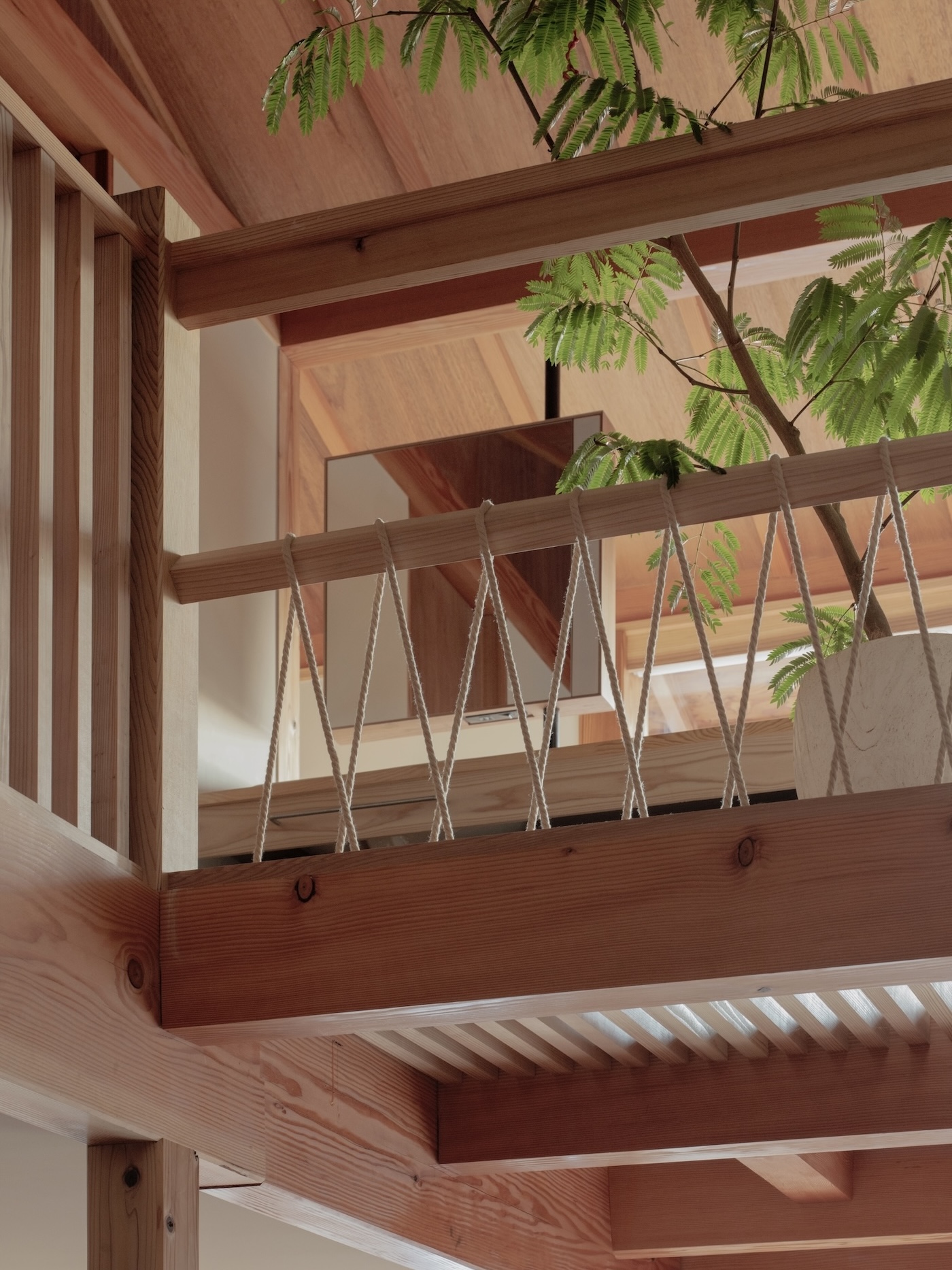 Further, the vertical frame adjacent to the column in the Japanese-style room shoji (shoji: translucent sliding screens made of thin wooden lattices covered with washi) is omitted by attaching a hardwood screen to the edge of the interior-side sliding door. On the second floor, the columns and beams act as frames for the sliding doors, thereby eliminating part of the door frames. These operations enhance the independence of the structural skeleton and draw out a clear expression related to shinkabe construction.