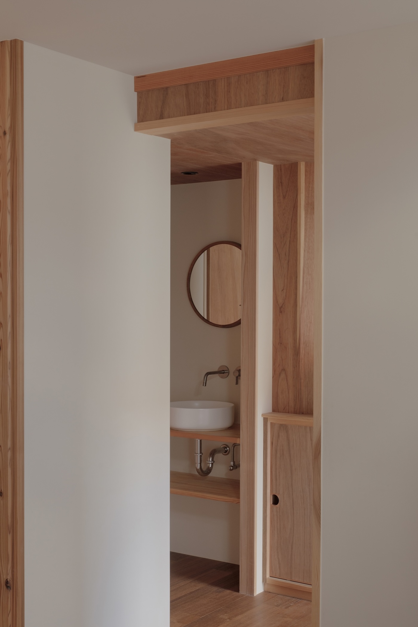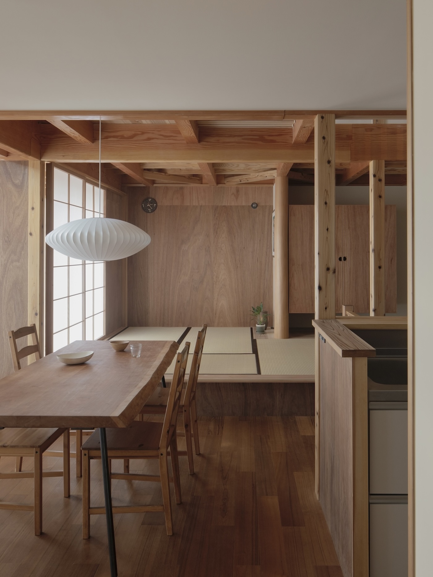 For the couple, who enjoy cooking, the kitchen and dining room are placed at the center of the house, with other domestic functions compactly arranged around them. Toward the east, where the land drops, a large opening and an engawa veranda (engawa: a narrow wooden platform or corridor connecting interior and garden) are introduced, allowing one’s awareness to naturally extend outward. The house was conceived as a place where a family of five can live comfortably, without a sense of constraint.