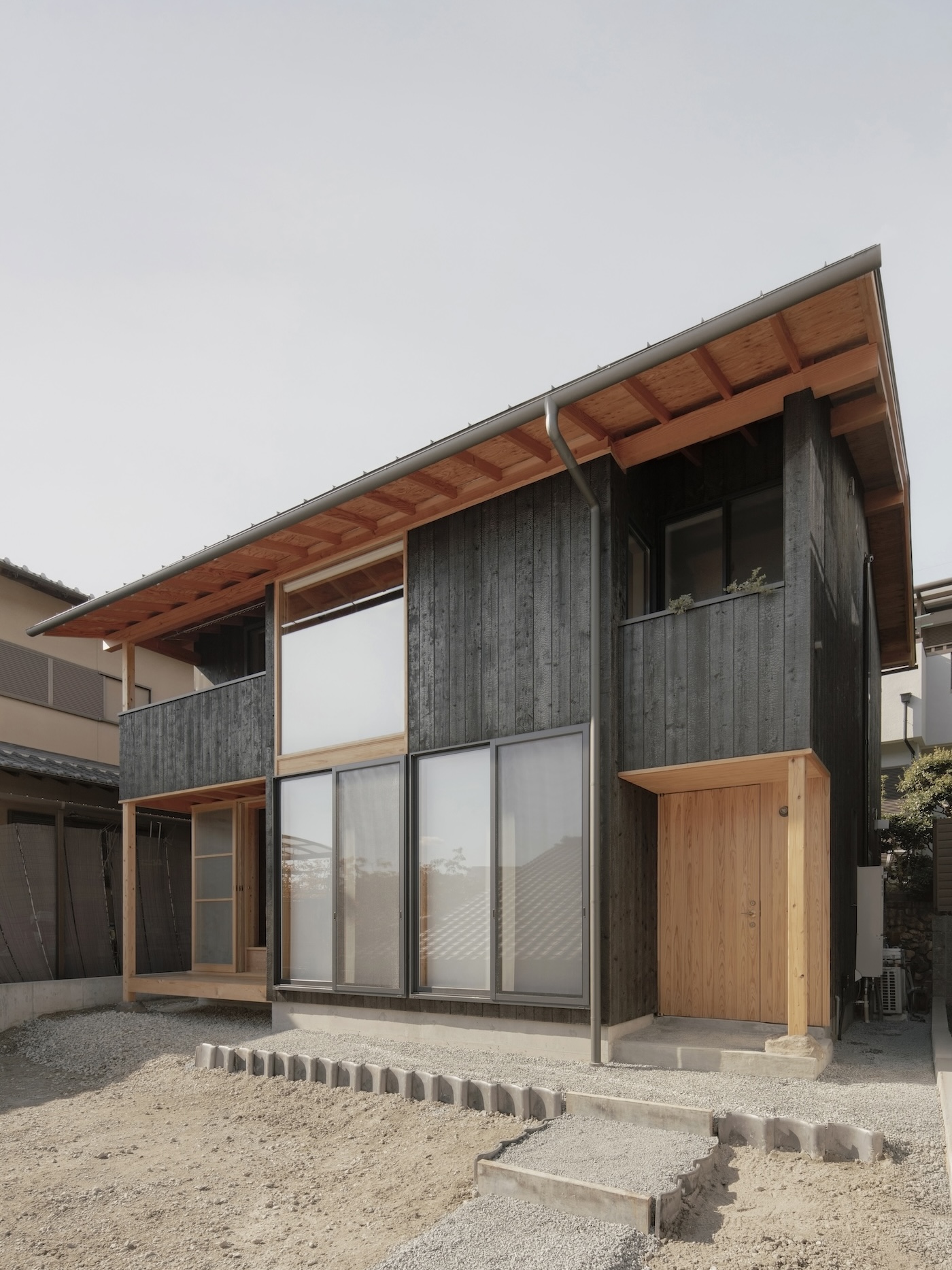 建物は周囲の環境に馴染むよう、総2階建てに切妻屋根をかけたシンプルな形状とし、焼杉で仕上げた慎ましい外観とした。階高を抑えつつ構造を現し、2階床を1階天井と兼ねた杉板一枚とすることで、材料や工事を減らしながら開放感を確保している。建材は手に入りやすい一般的なものに限定し、工種が増える仕様を避け、大工の手で完結できるものを採用した。料理好きの夫婦のために台所と食事室を家の中心に据え、その周囲に生活の諸要素をコンパクトに散らしつつ、土地の低い東側に向けて大きな開口と縁側を設け、自然と意識が外へと向かう、家族5人が伸びやかに暮らせる住まいを目指した。