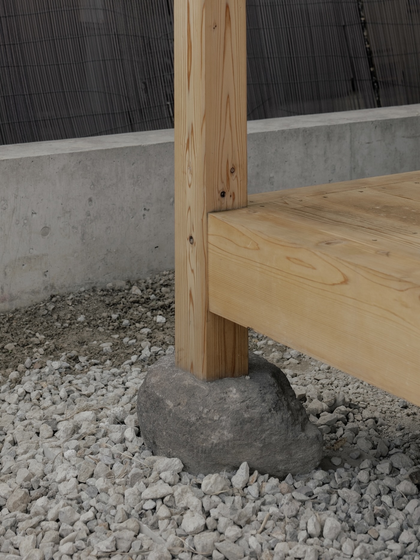 To harmonize with its surroundings, the building takes on a simple two-story gabled form. Its modest exterior is finished in charred cedar. While keeping floor heights low, the structure is exposed, and a single layer of cedar boards serves simultaneously as the second-floor flooring and the first-floor ceiling. In this way, a sense of openness is achieved while reducing both materials and construction processes. The construction materials were limited to readily available, standard products, and specifications that increase trade divisions were avoided in favor of materials that could be executed entirely by carpenters.