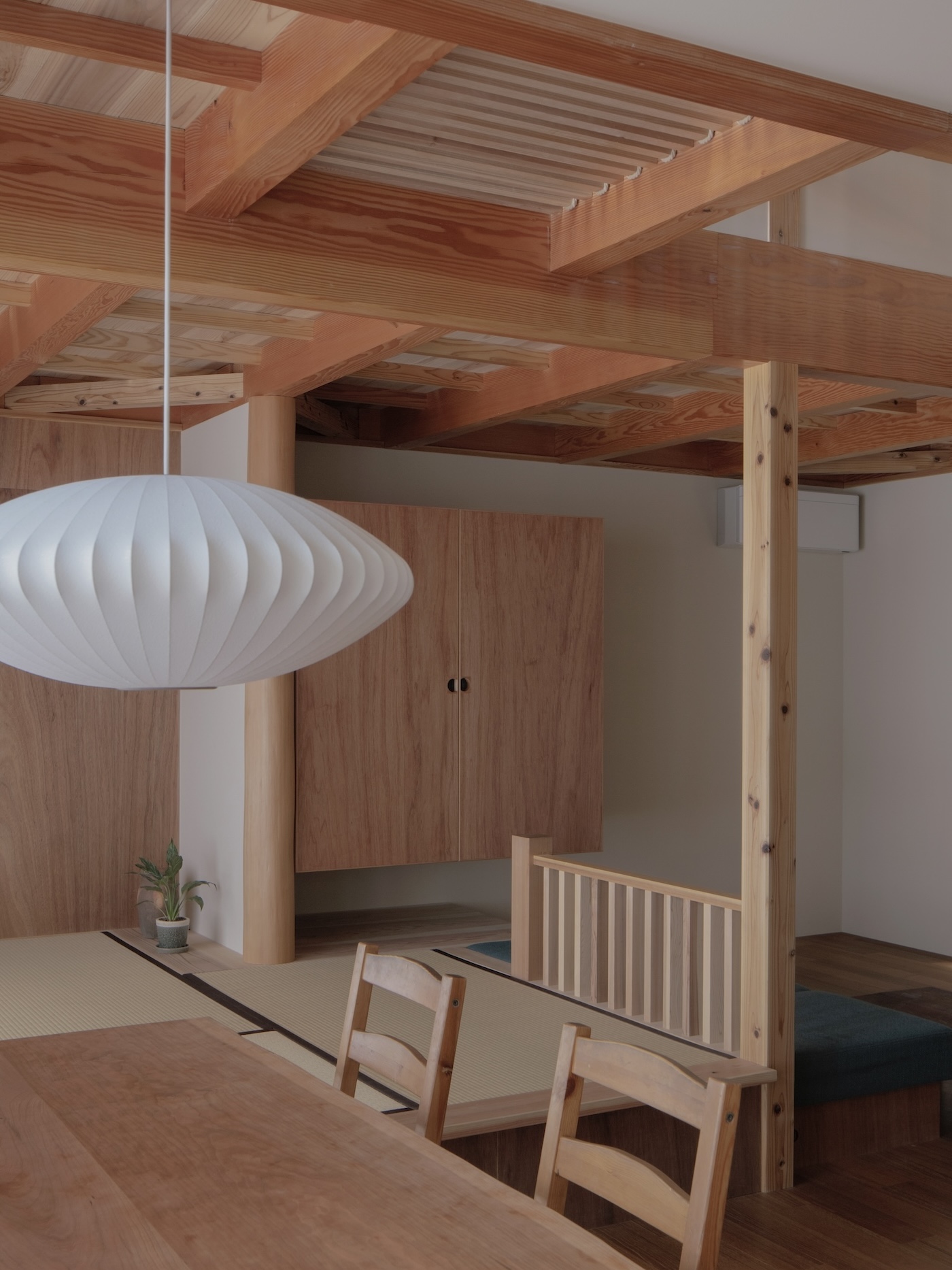 建主の要望、性能、コストといった住宅に求められる様々な条件を、日本家屋の意匠を現代的に解釈しながら、注意深く整えていった。和室では宙に浮いた押入れとささやかな床の間がソファと絡み合い、居間や食事室との境界を暈かす。地窓を塞ぐ板戸は、折り畳んで持ち手を天板の切り欠きに噛み合わせることで、テレビ台と一体造作のように収納できる。これは、日本建築に見られる、使うときだけ機能が立ち現れ、不要なときには空間や家具の一部として溶け込む可動性・兼用性から着想を得て考案したものだ。さらに、和室の障子では戸先に目隠し用の堅木を取り付けることで柱に絡む縦枠を省き、2階の引戸では柱梁そのものに鴨居や枠の役目を担わせ、枠を一部排除している。こうした操作により、軸組の独立性を際立たせ、真壁に通じる骨格の明快さを引き出している。
